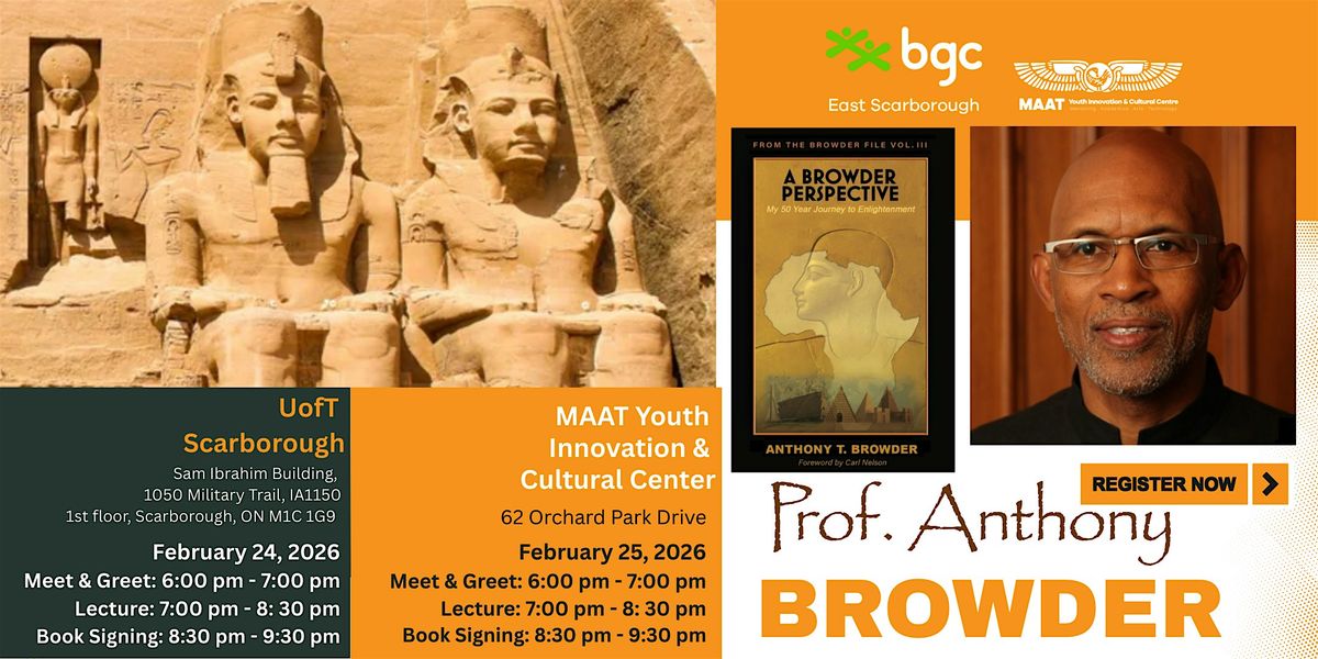 Join BGC East Scarborough and the MAAT Youth Innovation and Cultural Centre as we celebrate Black History with Anthony Browder, founder and director of IKG Cultural Resources, who has devoted 50 years to researching ancient Egyptian history, science, philosophy, and culture.