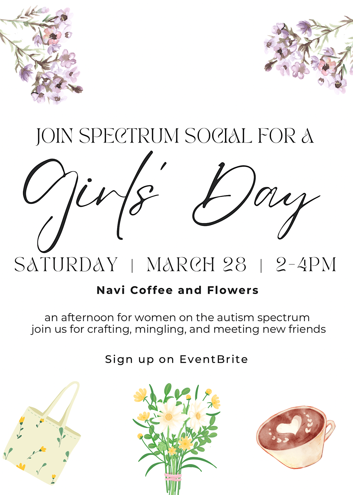 Join Spectrum Social for a girls' day filled with crafting, like-minded company, and chatting at Navi Coffee and Flowers. We will be designing our own tote bags (craft materials and totes provided by host). This event is for women on the autism spectrum; participants who are not on the spectrum are welcome however they must be accompanied by someone who is on the spectrum.