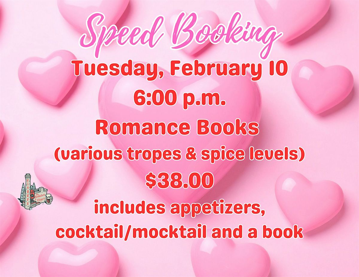 Join us for a special Romance-themed Speed Booking! Tuesday, February 10 at 6:00 p.m. attendees will get to "try on" 20 different Romance books. Different tropes and different levels of Spice will be represented, but all 20 books guarantee an HEA. Everyone who attends will go home with one book and enjoy appetizers and a signature cocktail/mocktail.
