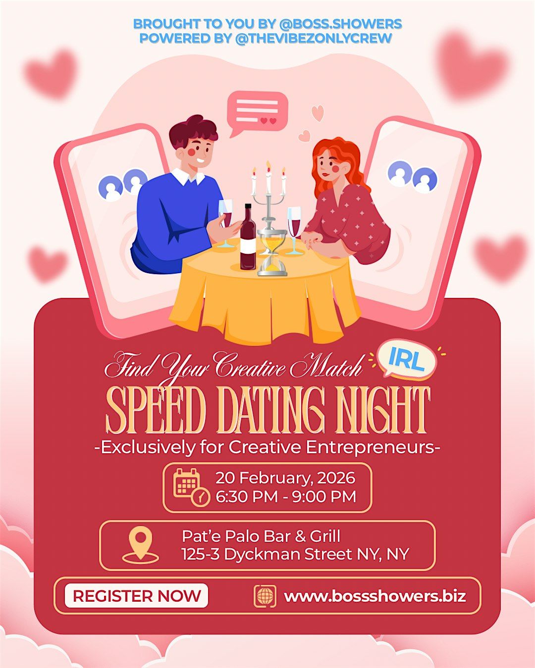 Welcome to Find Your Creative Match IRL - a curated Speed Dating Night for creative entrepreneurs, small business owners, and artists who are tired of dating apps and ready to meet like-minded people In Real Life.
