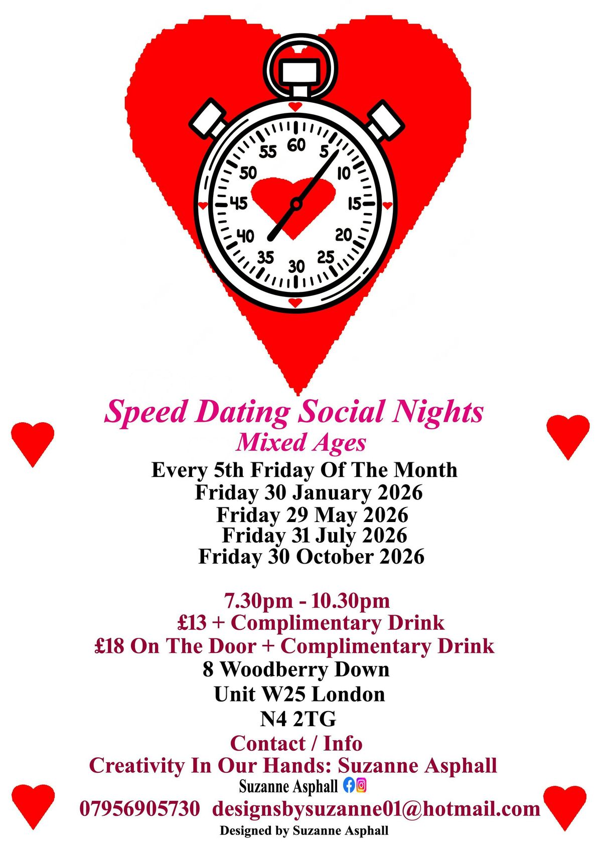 Speed Dating Social Nights. A social and musical evening, for those who love to listen and dance to music. To also meet people in a social environment. Taking place at Creativity In Our Hands: Suzanne Asphall. 8 Woodberry Down. Unit 25, N4 2TG.