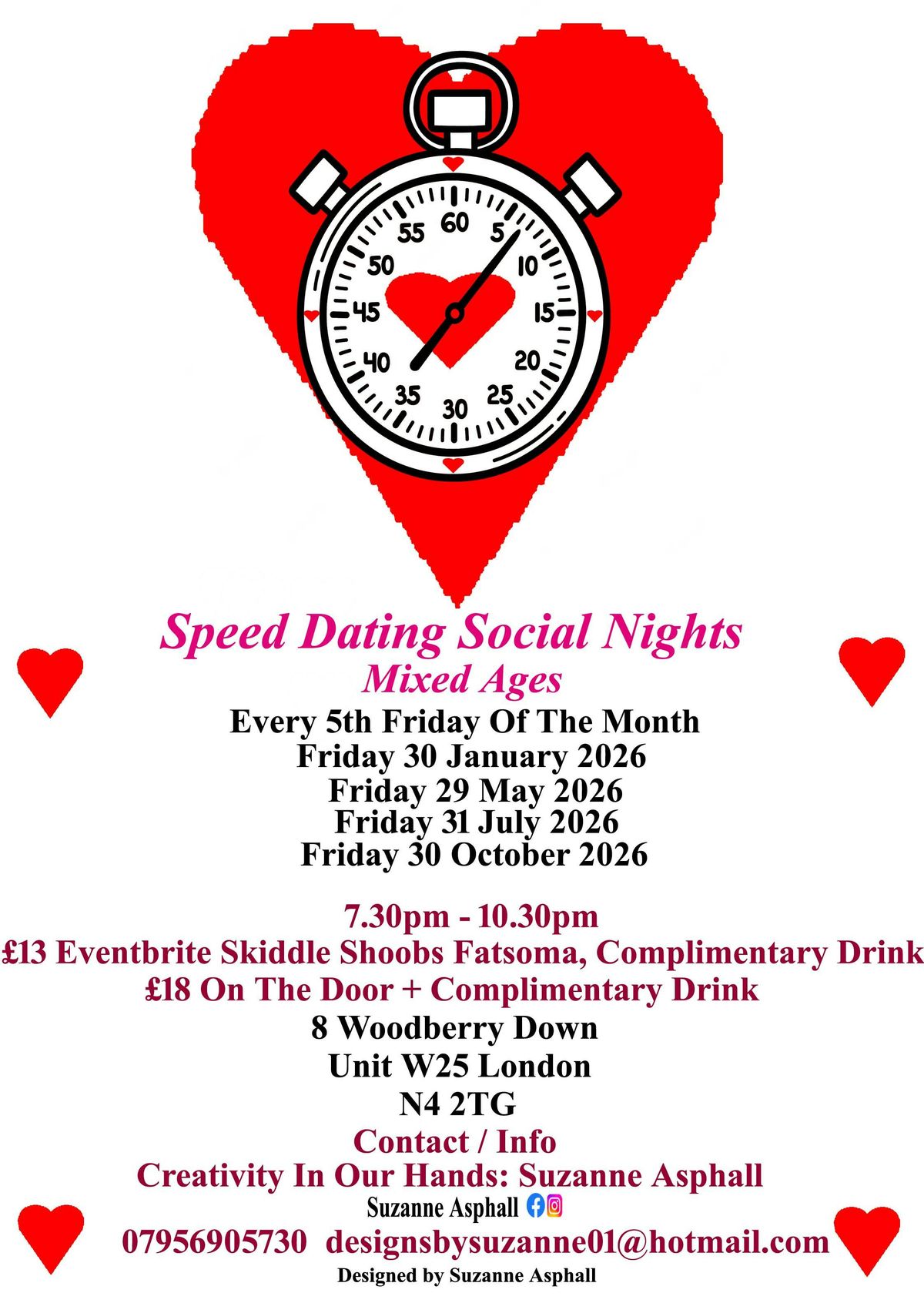 Speed Dating Social Nights. A social and musical evening, for those who love to listen and dance to music. To also meet people in a social environment. Taking place at Creativity In Our Hands: Suzanne Asphall. 8 Woodberry Down. Unit 25, N4 2TG.