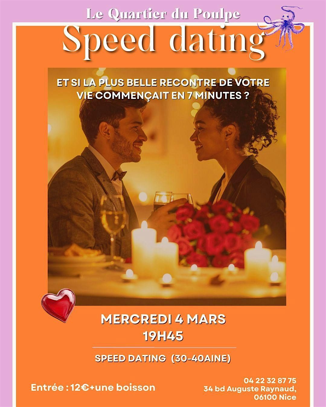 Envie de rencontrer des célibataires sympa en 30aine et 40aine ? Rejoignez-nous pour un speed dating en personne, plein de bonne humeur et de belles rencontres. C’est l’occasion parfaite pour échanger, rigoler et peut-être trouver quelqu’un qui vpus correspond. Alors, prêt(e) à tenter votre chance ?