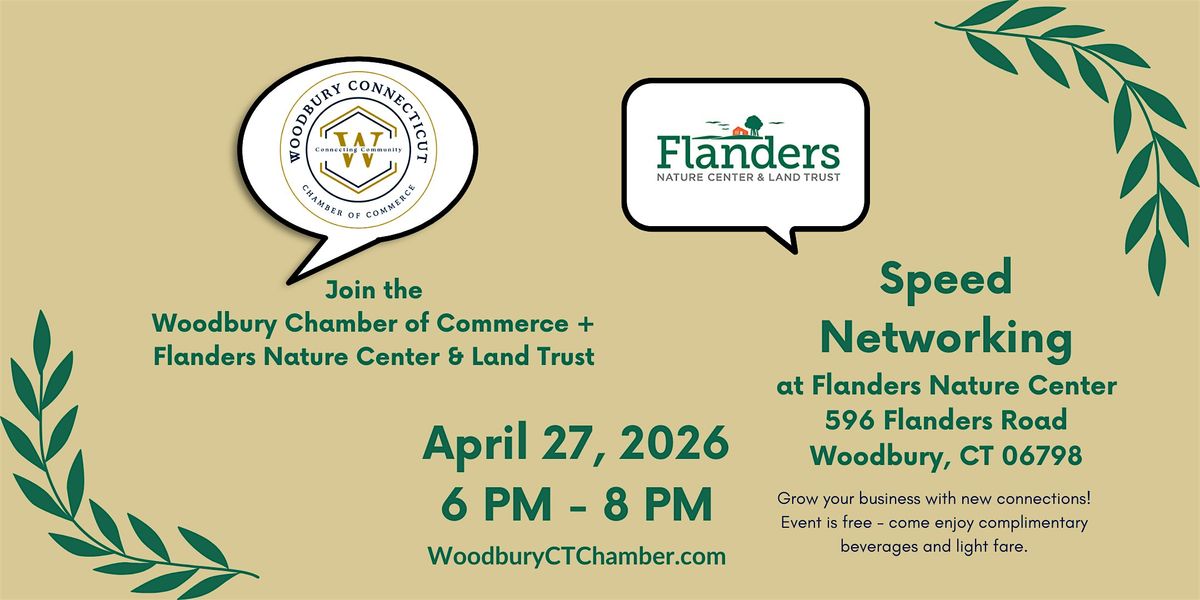 Welcome to Woodbury Chamber of Commerce's Speed Networking event! Join us for a fun and fast-paced evening of making new connections at the Flanders Nature Center and Land Trust. This in-person event is your chance to meet fellow professionals, exchange business cards, and expand your network in a stress-free setting. Networking can be hard work, but we promise this will be a night you'll enjoy!