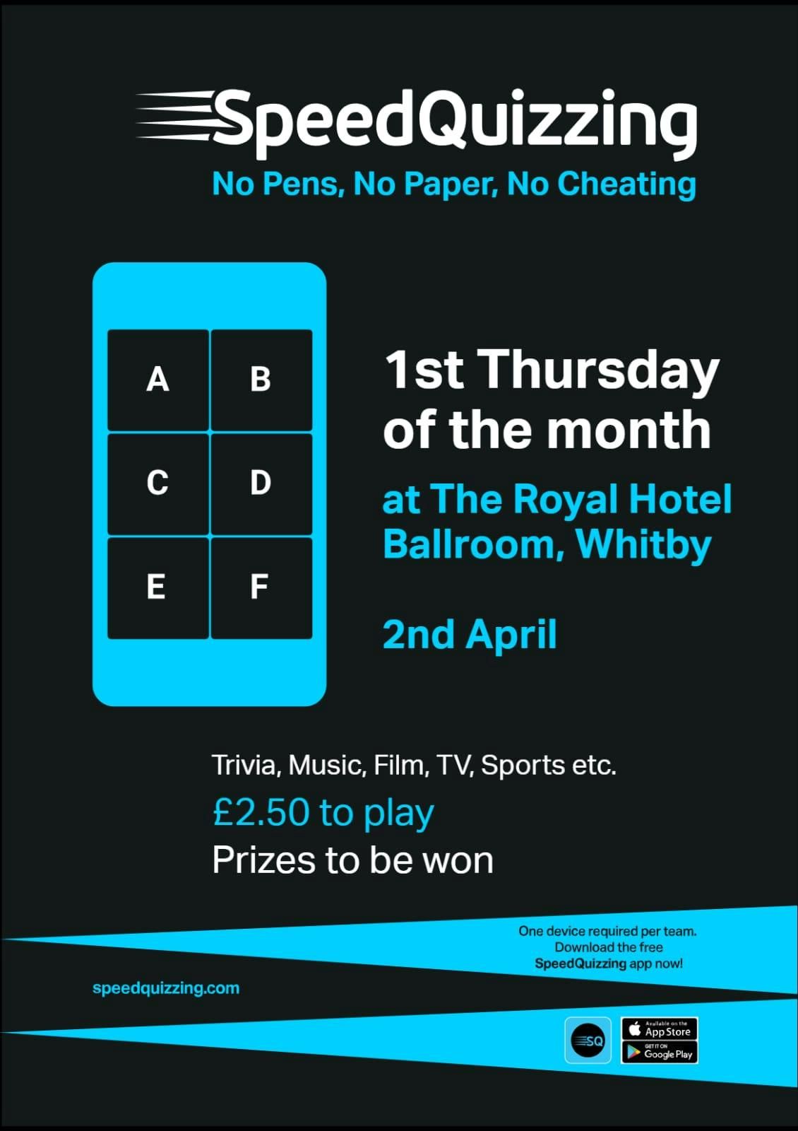 Get ready to speed quiz at the Royal Hotel Whitby time to flex those fingers. First fun quiz starts 2nd April. Teams of 4 max and £2.50 per person