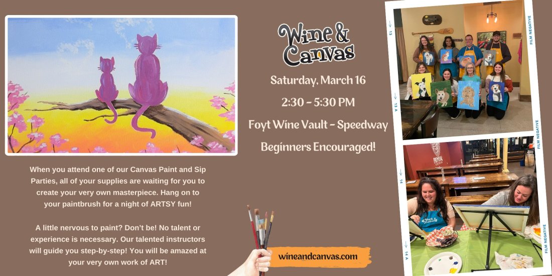 Stare out at a colorful ombre sunset with two new friends “Cat and Kitten”! This exciting Speedway paint and sip features two kitties who’ve climbed up a tree for the perfect sunset view. Savor excellent drink selections from Foyt Wine Vault snack on delicious goodies and socialize with friends while you create one-of-a-kind masterpieces! Zero experience is required to make a fabulous work of art.