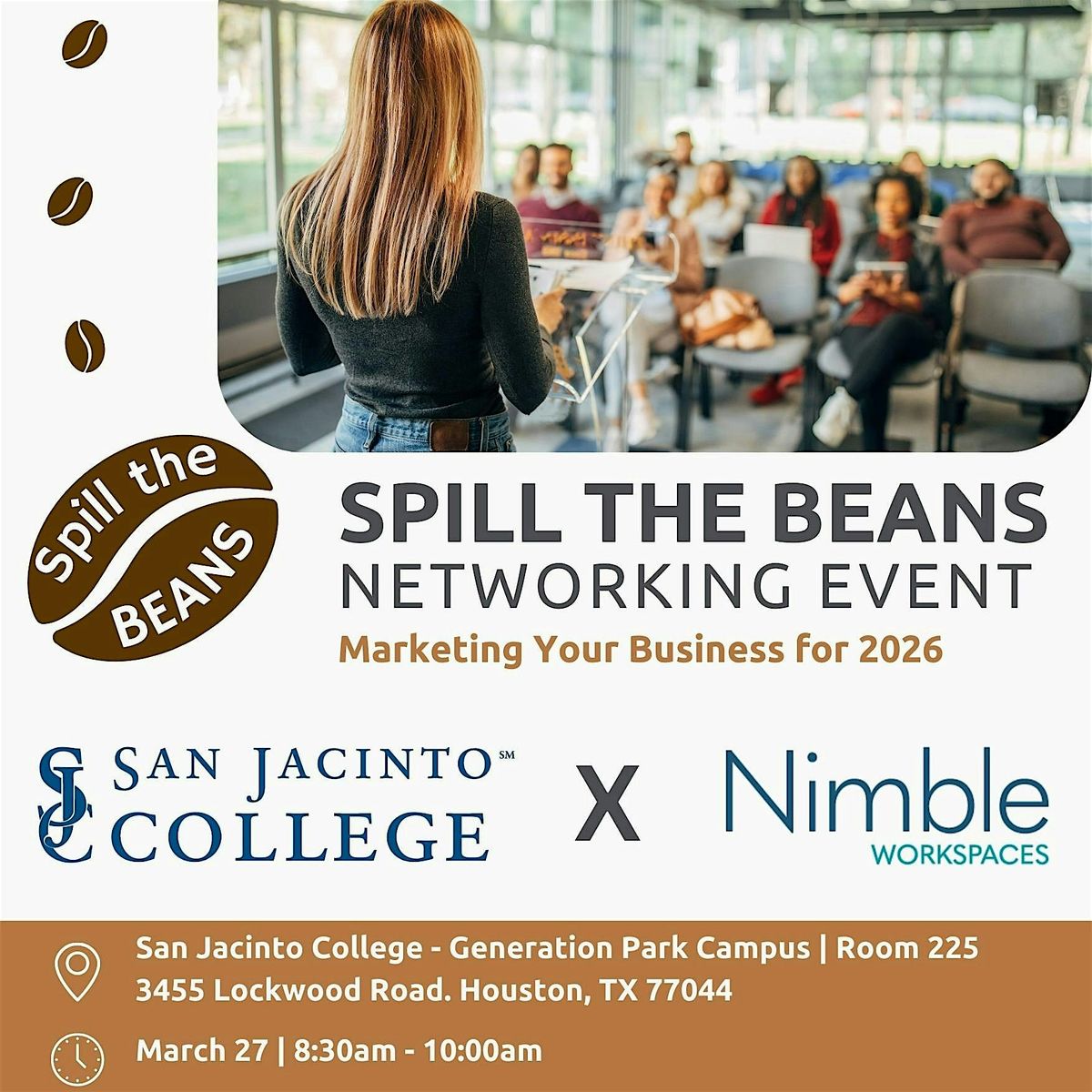 Join us for Spill the Beans, a networking event for business owners, entrepreneurs, and anyone interested in professional networking around the Lake Houston area! Hosted in collaboration with Nimble Workspaces and San Jacinto College, this event will take place at San Jacinto College: Generation Park
