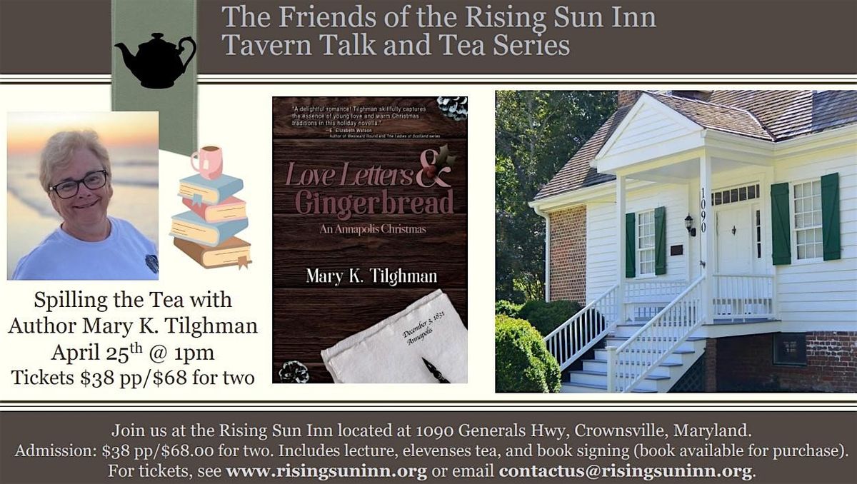 Join the Friends of the Rising Sun Inn for another edition of our Tavern Talk and Tea Series as we welcome local Maryland author Mary K. Tilghman on Saturday, April 25th at 1PM as she "Spills the Tea" on her book Love Letters & Gingerbread, An Annapolis Christmas. Enjoy an Elevenses Tea with tea and sweets while she discusses her book. Sweets include desserts found in the book.
