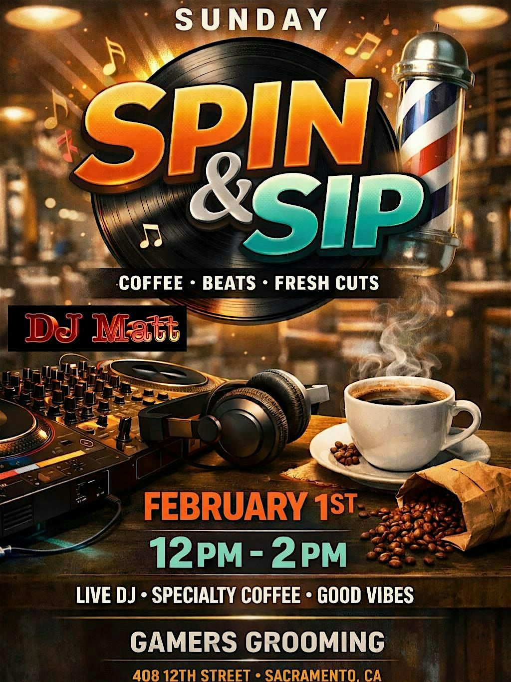 Spin & Sip at Gamers Grooming ☕ DJ Matt, specialty coffee, fresh cuts, and chill Sunday vibes. Feb 1 | 12–2 PM SacramentoAbout this Event