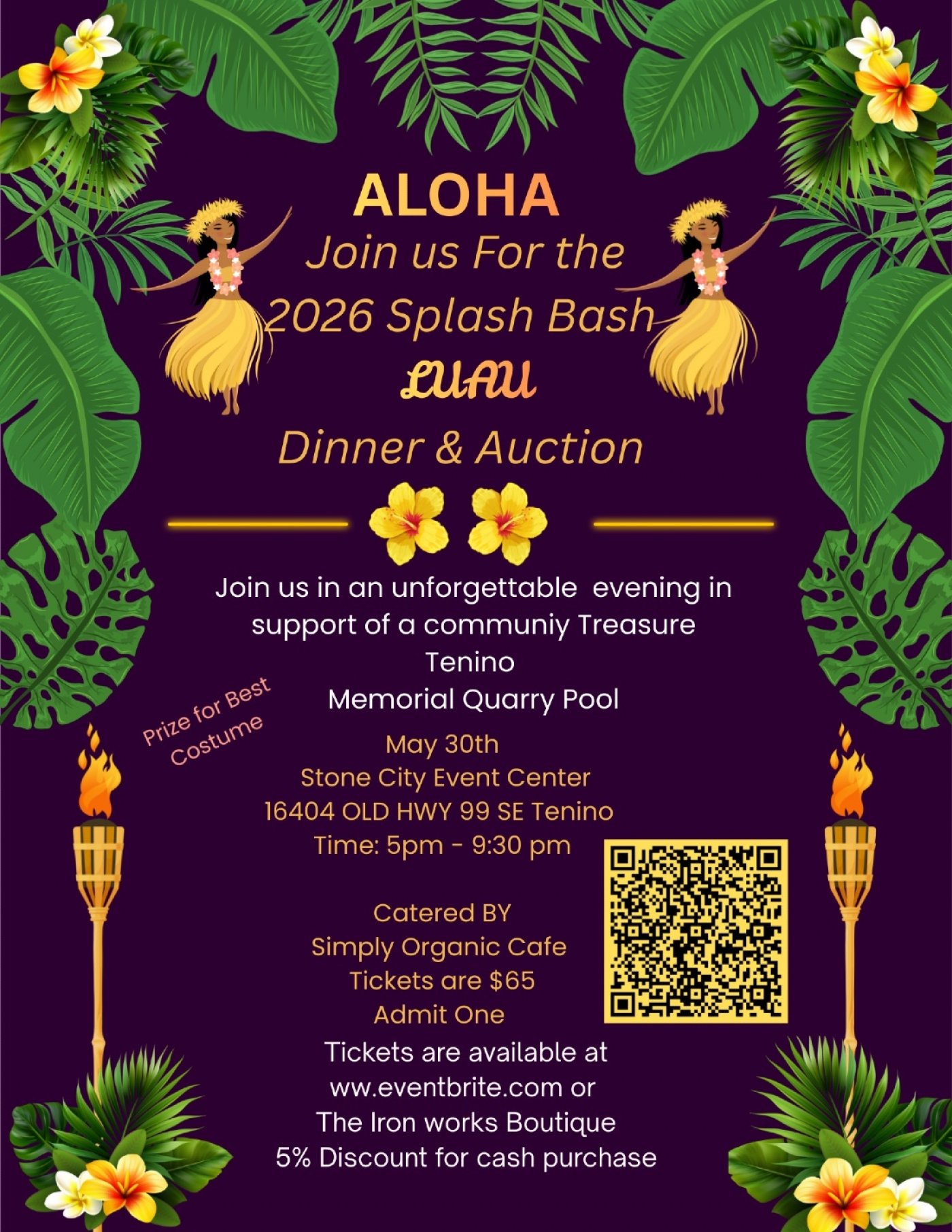 Grab your grass skirts and aloha spirit and join us for an unforgettable evening in support of a community treasure! Enjoy a delicious luau-style dinner catered by Simple Organic Cafe , exciting auction items and island vibes- all for a great cause. Your support keeps the Tenino Quarry Memorial Pool thriving for generations to come. Mark your calendar and come make a spash with us.