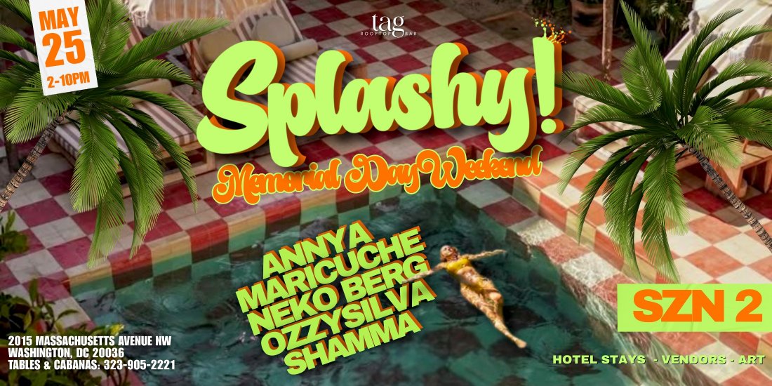 This Memorial Weekend Sunday, May 25th, join us at the stunning Ven Embassy Row’s Tag Rooftop as we kick off Season Two of DC’s hottest pool party — Splashy! Get ready for a day filled with vibrant music, refreshing drinks, and an immersive vendor experience that will elevate your summer vibes.
