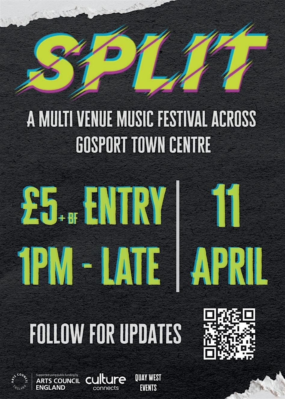 On Saturday 11th April, four locations around Gosport Town Centre will come together to host the second edition of SPLIT, a multi‑venue music festival, brought to you by Quay West Events in partnership with venues and promoters to be announced soon.