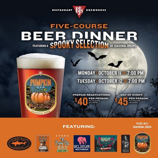 Join us for our “Spooktacular” Beer Dinner featuring a variety of seasonal pumpkin ales and spooky beers paired with great flavors from BJ's, including our world-famous Salted Caramel Pizookie®!This beer dinner will have 5 courses and 7 featured beers with a price point of $40 per person for prepaid reservations & $45 per person the day of the event.