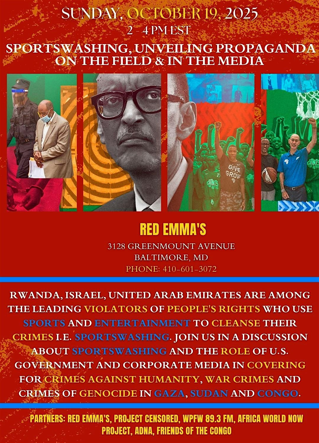 Rwanda, Israel, and the United Arab Emirates are among the leading violators of people's rights who use sports and entertainment to cleanse their crimes, a practice known as Sportswashing. Join us for a discussion about sportswashing and the role of the U.S. government and corporate media in covering crimes against humanity, war crimes, and acts of genocide in Gaza, Sudan, and Congo.