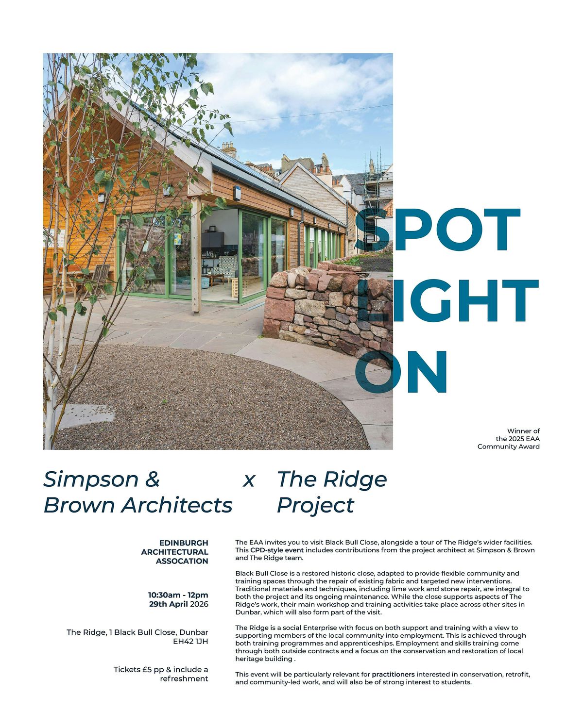 Black Bull Close is a restored historic close, adapted to provide flexible community and training spaces through the repair of existing fabric and targeted new interventions. Traditional materials and techniques, including lime work and stone repair, are integral to both the project and its ongoing maintenance. While the close supports aspects of The Ridge’s work, their main workshop and training activities take place across other sites in Dunbar, which will also form part of the visit.