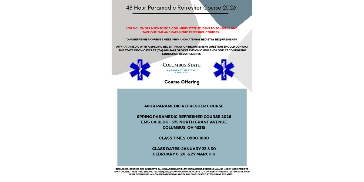 Columbus State ommunity College - Emergency Medical Services is pleased to offer our 48-Hour Paramedic Refresher Course for Spring 2026. This course meets both Ohio and National Registry requirements and is open to all paramedics—no need to be a Columbus State student. No specific textbook is required, but access to a current paramedic-level text is recommended. Course runs Jan 23rd & 30th, Feb 6th , 20th, 27th , & March 6th from 9am to 6pm each class day.
