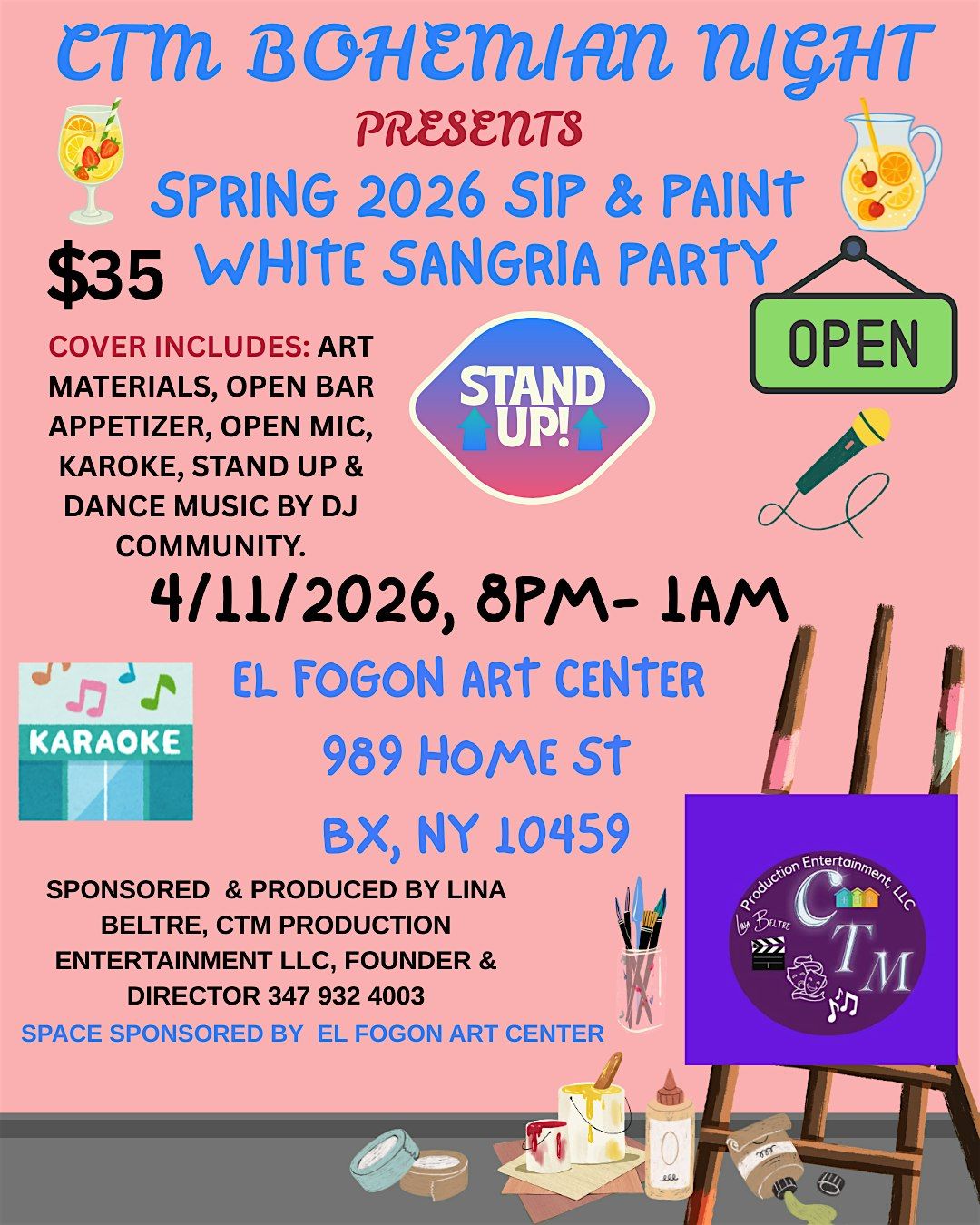 BUEEENASS! CTM BOHEMIAN NIGHT SPRING 2026 SIP & PAINT WHITE SANGRIA PARTY! 8PM TO 1AM PARTY! 18 AND OVER, 21 TO DRINKTHE PARTY STARTS AT 8PM AND ENDS AT 1AM IN THE MORNING. THE COVER $35 INCLUDES ART MATERIALS, OPEN BAR , APPETIZER, MUSIC BY DJ COMMUNITY, OPEN MIC, KAROKE, OPEN MIC. FOR OPEN MIC REGISTER AT THE DOOR. IF YOU HAVE BOOKS BRING THEM SALE AND PROMOTE THEM. CREATE AN ART PIECE AS YOU LISTEN TO MUSIC, POETRY, STAND UP COMEDY, BUT MUST OF ALL HAVE FUN.