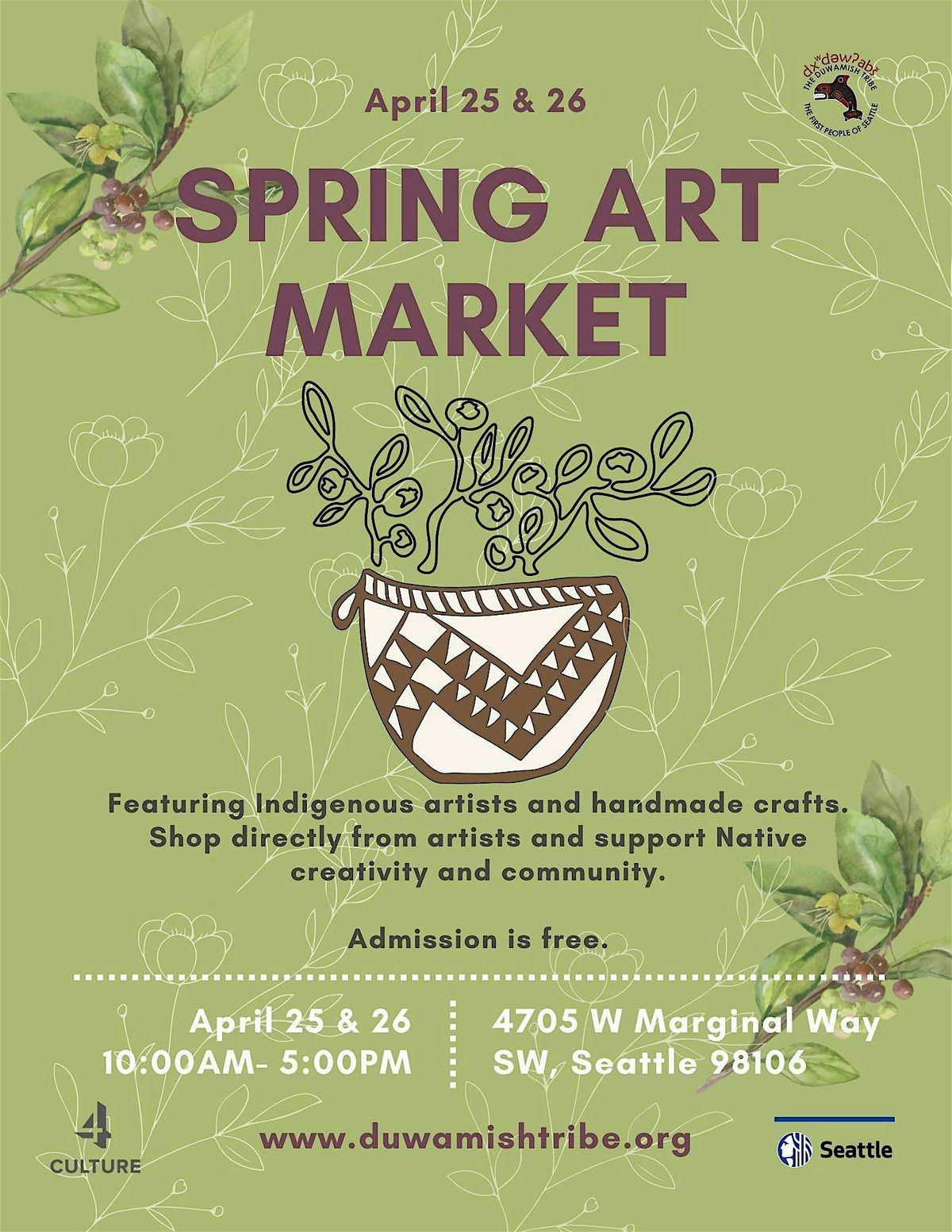Duwamish Longhouse Spring Art Market April 25 & 26th, 10–5. Indigenous art, jewelry, food & culture. Free admission, all welcome in Seattle.