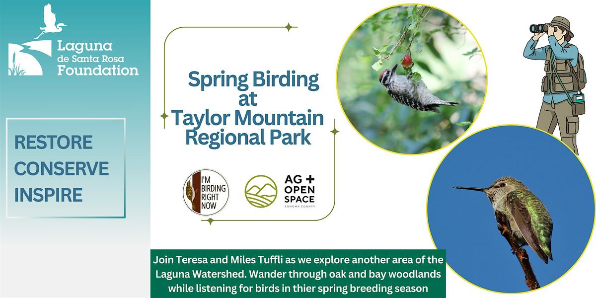 Join the Laguna de Santa Rosa Foundation and Sonoma County Ag and Open Space, along with Teresa and Miles Tuffli for a spring birding walk exploring Taylor Mountain Regional Park in Santa Rosa. We’ll explore the oak and bay woodlands of the Lower Colgan Loop Trail by walking slowly and pausing frequently to observe and discuss the bird life. Spring is a wonderful time to go birdwatching in Sonoma County and enjoy the rich array of birdsong -- we'll be on the lookout for the variety of birds who make the area their home for the breeding season. Let's explore another area of the Laguna Watershed!