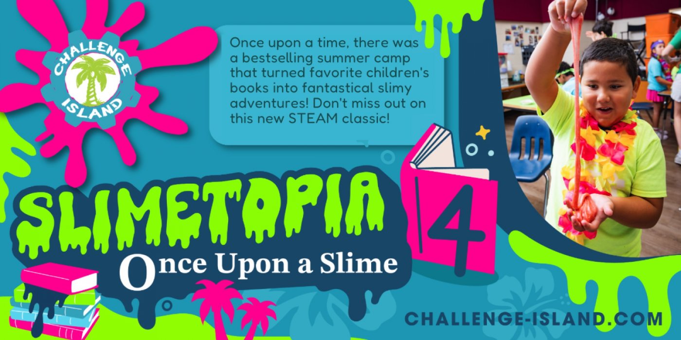 Once Upon a Slime there was a bestselling Challenge Island Slimetopia® camp that turned children’s favorite books into fantastical slimy adventures! Our innovative STEAM Teams will mix up a library-full of book inspired slimes like Alice's Unbirthday Cake Slime, Violet Beauregarde’s Blueberry Bubble Gum Slime, Percy Jacksons's Medusa Hair Slime, Dog Man's Evil Hot Dog Slime, and STEAMwarts Butter Beer Slime. They will also learn about the magic behind the stories and work together to tackle epic book-related engineering challenges.