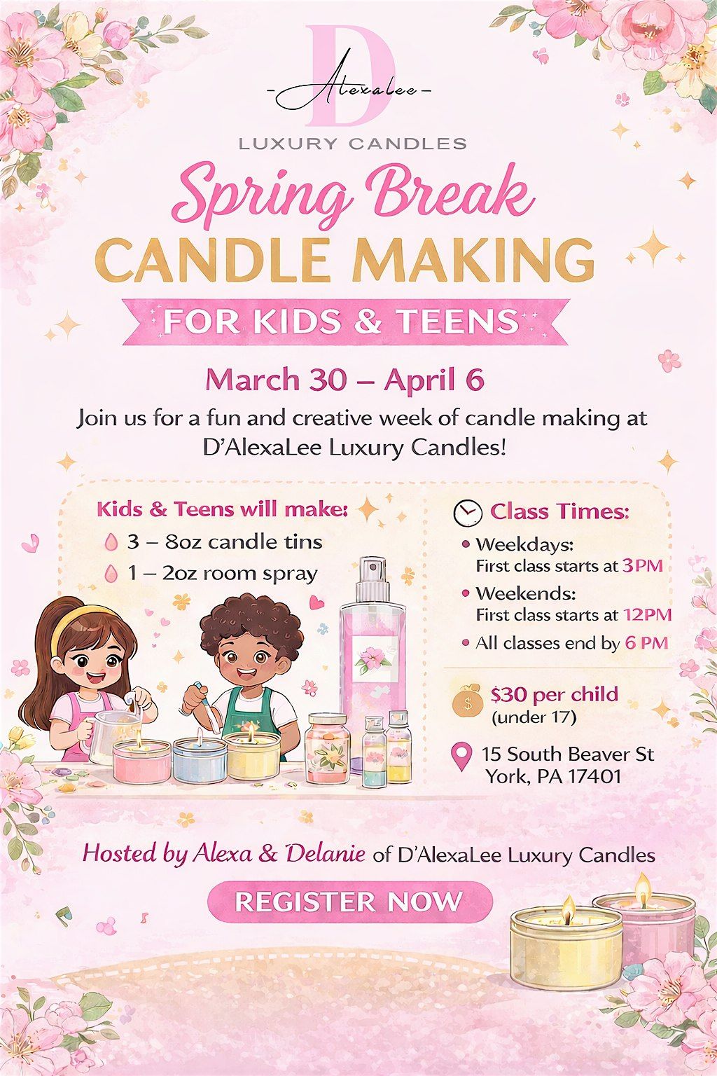 Get ready for some fun and creativity this spring break! Join us in person for an exciting candle-making workshop designed especially for kids and teens. You'll learn how to craft your very own awesome candles, picking from cool colors and scents. It's a perfect way to spend your break, make new friends, and take home something handmade and unique. Don't miss out on this hands-on adventure — can't wait to see you there!
