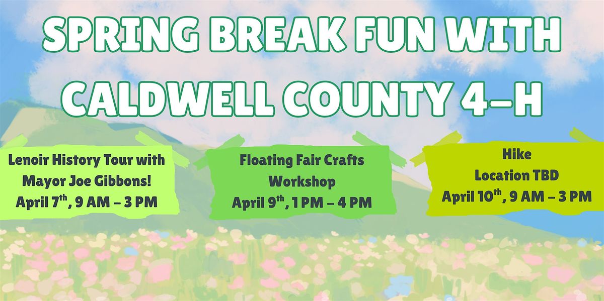 Let’s make this Spring Break one to remember! Join Caldwell County 4-H for three exciting days of adventure, creativity, and local exploration. Each event is limited to 20 participants to keep the experience fun, safe, and hands-on. Ages 8 and up are welcome (younger youth may attend with a parent/guardian who provides transportation , please contact us before registering).