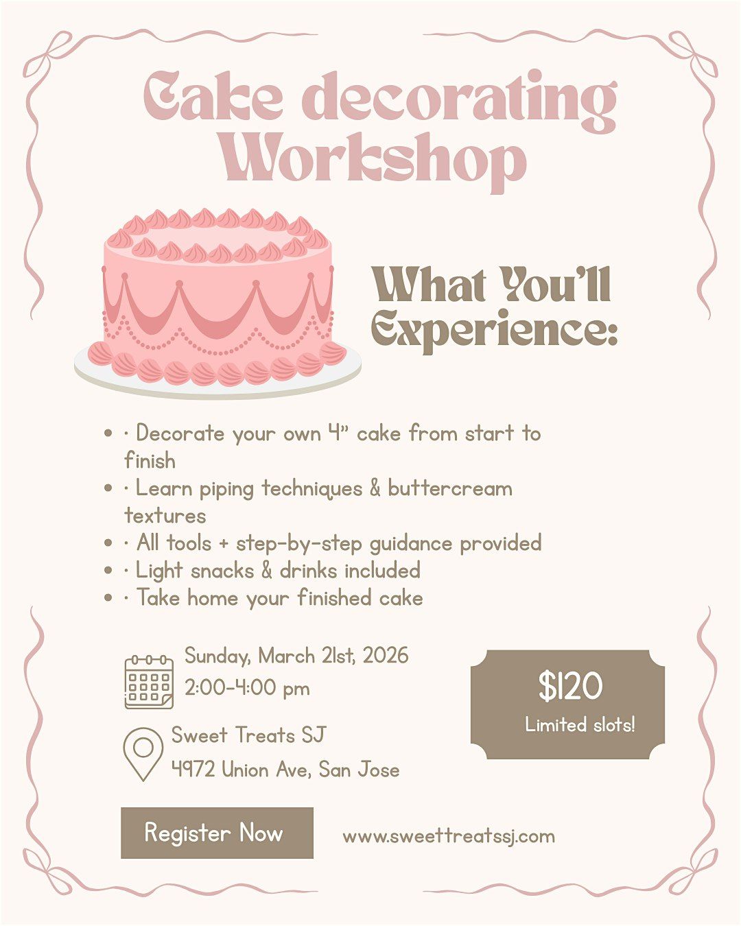 In this 2-hour in person hands-on workshop, you’ll decorate your own 4” cake from start to finish while learning piping techniques and buttercream textures in a relaxed, supportive setting.