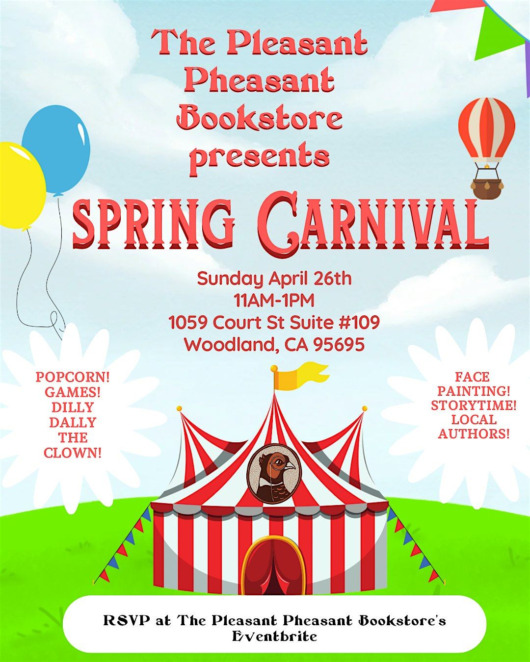 Get ready to have a blast at the Spring Carnival! Join us for a day celebrating independent bookstores and reading filled with fun games, popcorn and entertainment including facepainting and the wonderful Dilly Dally the clown.