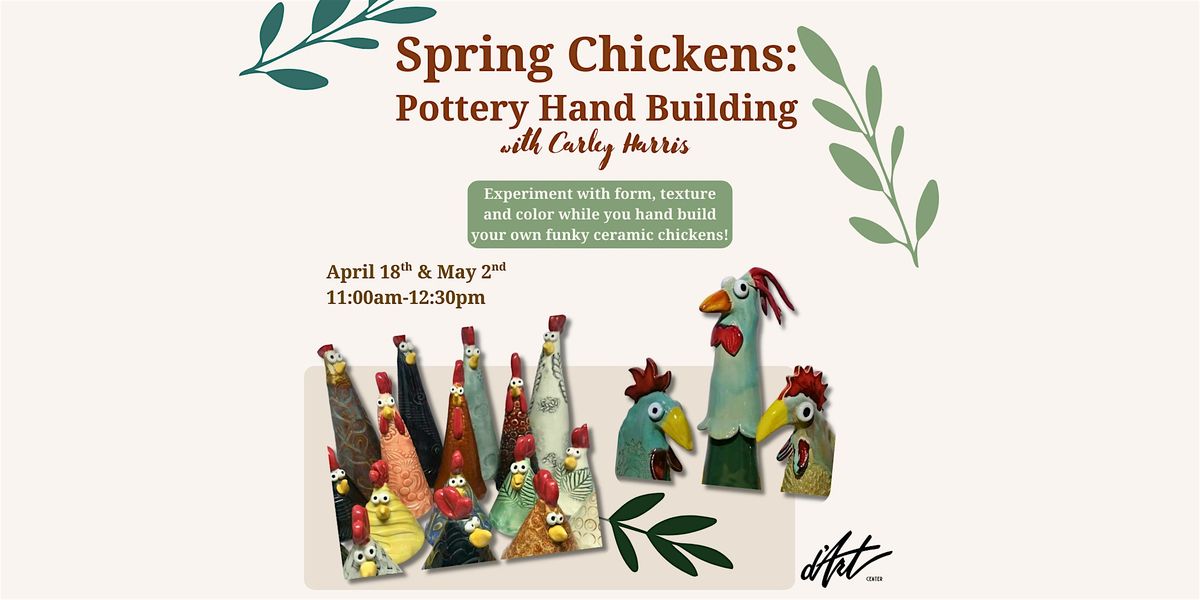 Enjoy a creative afternoon with Instructor Carley Harris while you learn how to hand build your own spring chickens out of clay. Experiment with form, texture and color!