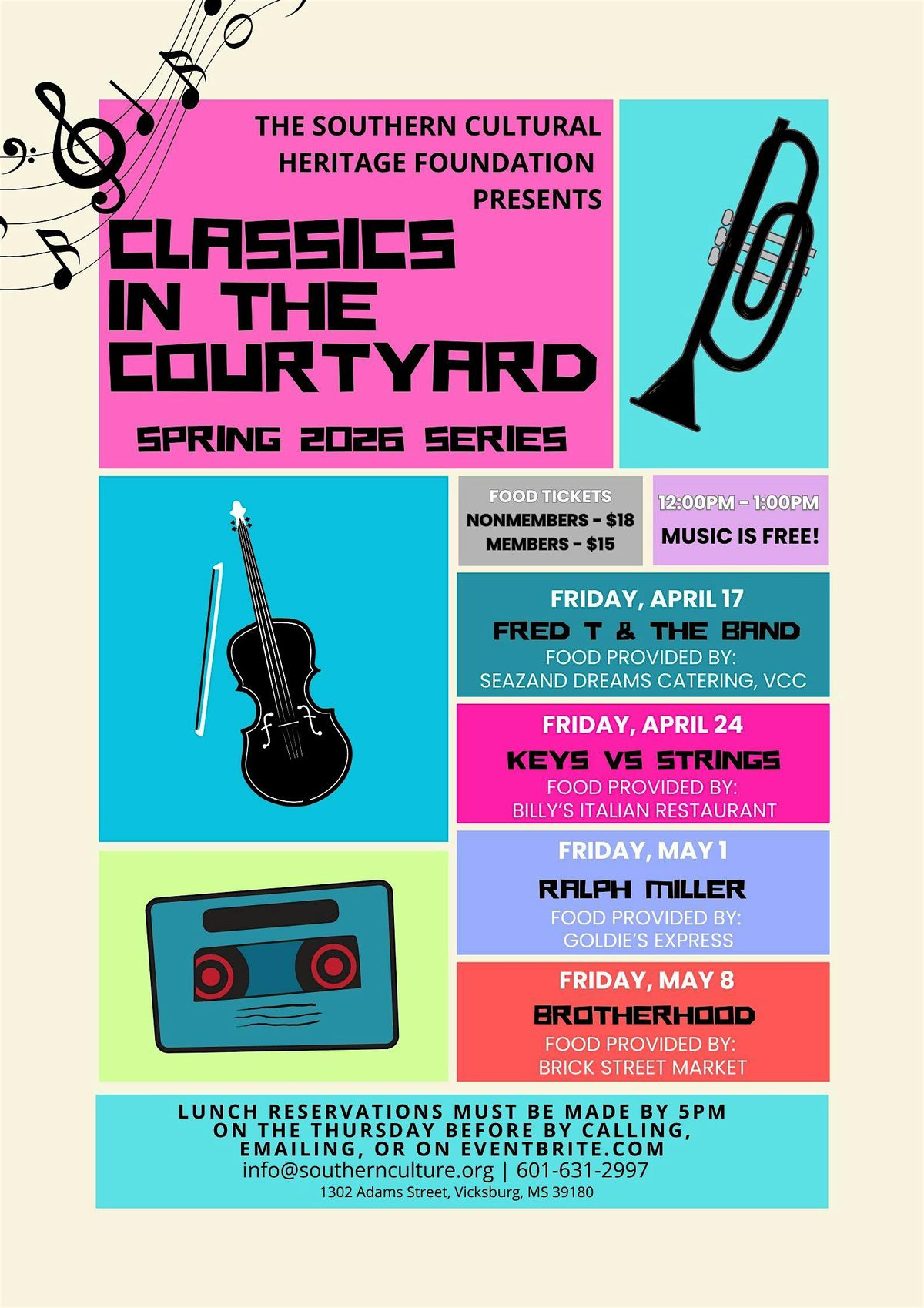 The Southern Cultural Heritage Foundation (SCHF) is so excited to continue a spring series of “Classics in the Courtyard”. This event will offer a variety of entertainment through different genres of classic music. Local entertainers and local restaurants will provide the music and lunch on Fridays from 12:00pm- 1:00pm beginning April 17th and ending May 8th. The musical entertainment is provided for free and lunch can be purchased for $18 per person, $15/SCHF members. Reservations are required for lunch and must be made by 5pm on the Thursday before the event.