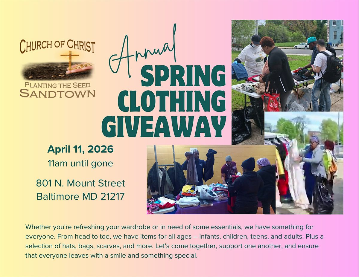 Hey there! Join us for the Spring Clothing Giveaway happening at 801 N Mount St. Swing by on April 11, 2026 at 11:00 AM (Eastern Time) to grab some fresh clothes for the season. It’s a great chance to refresh your wardrobe and meet people in the neighborhood. Clothing, shoes, and accessories for men, women, boys, girls, and babies.