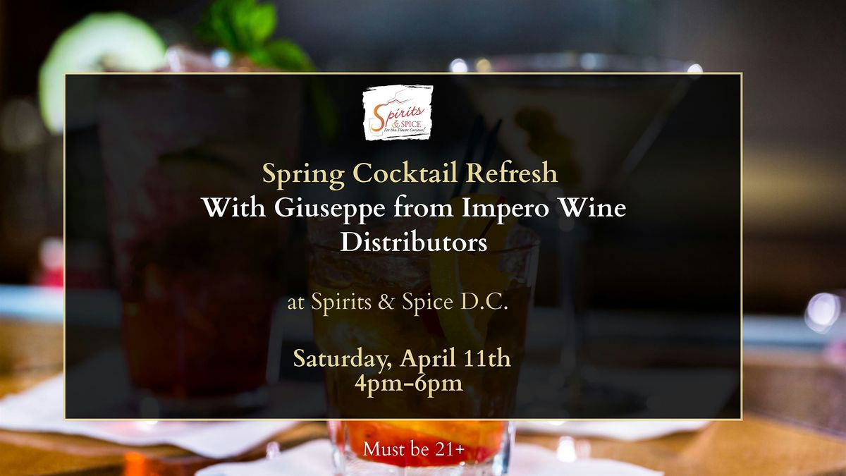 Join us at Spirits & Spice Washington D.C on April 11, 2026 at 4:00 PM (Eastern Time) for a fun and relaxed afternoon! Giuseppe from Impero Wine Distributors will guide you through some fresh spring cocktails. Whether you're a cocktail newbie or a seasoned sipper, this is the perfect chance to learn, taste, and enjoy great vibes. Don’t miss out on this tasty experience!