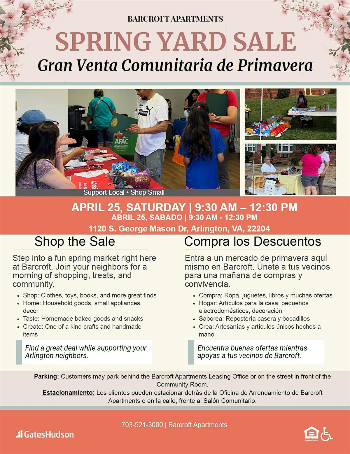 Acompáñanos al Spring Yard Sale de Barcroft Apartments el sábado 25 de abril de 2026, de 9:30 AM a 12:30 PM en 1120 S. George Mason Dr, Arlington, VA 22204. Ven a encontrar excelentes ofertas, apoyar a los residentes y vendedores locales, y disfrutar de una mañana divertida de primavera en la comunidad.