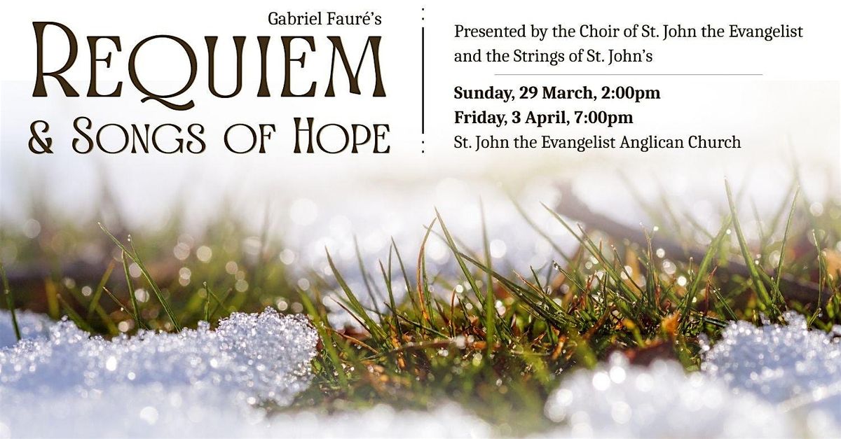 Join us for our Spring Concert at St. John's, titled "Requiem & Songs of Hope," featuring a performance of Gabriel Fauré's timeless Requiem Op. 48 arranged for chamber orchestra by John Rutter. This concert is presented by the Choir of St. John the Evangelist, and the Strings of St. John's under the direction of Nicholas Busch.