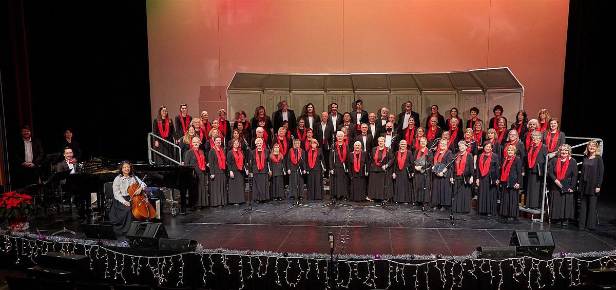 We are a mixed choir of 75–82 members, founded in 2013. Under the direction of our fearless leader Ingrid Gay, and accompanied by Vincent Lo, we take pride in delivering heartfelt performances to our audiences. We hope you'll join us for this festive concert featuring a wonderful repertoire of music—some familiar, some new—for your listening pleasure.
