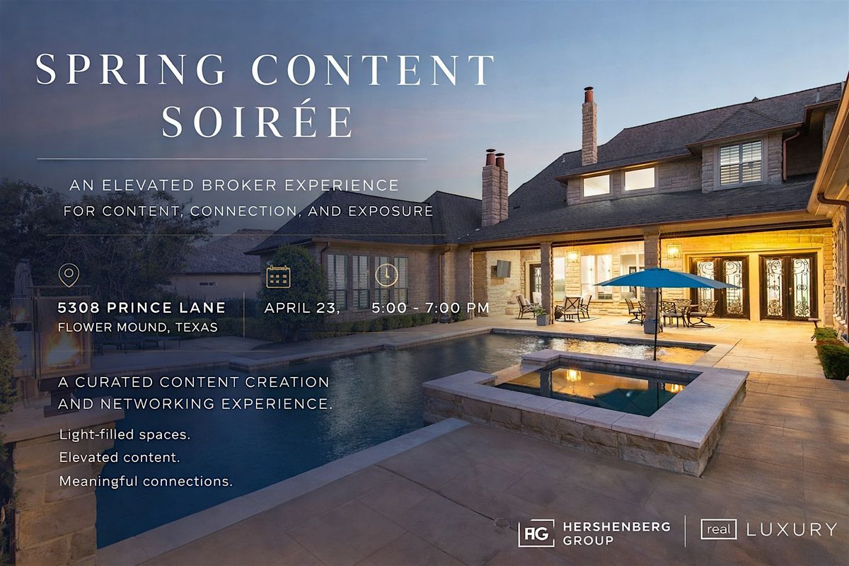 Join us for the Spring Content Soirée—an exclusive evening set within a stunning Flower Mound estate, curated specifically for agents looking to create high-quality content while building meaningful industry relationships.
