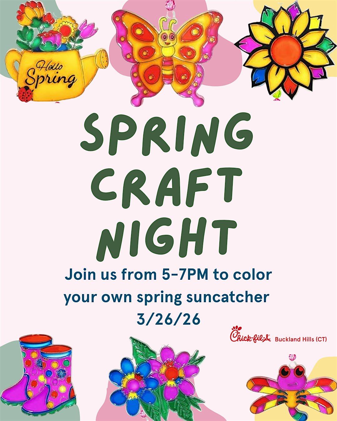 Join us on March 26th from 5–7PM for Spring Craft Night. Families can color and design their own beautiful spring suncatcher and enjoy a fun evening of creativity and seasonal cheer!