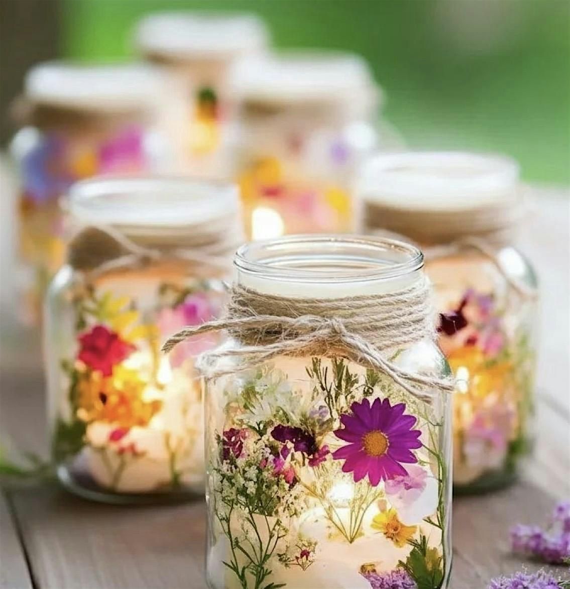 Mason jar, Pressed flowers , Modge podge, Brushes, Twine & a Tea light candle!