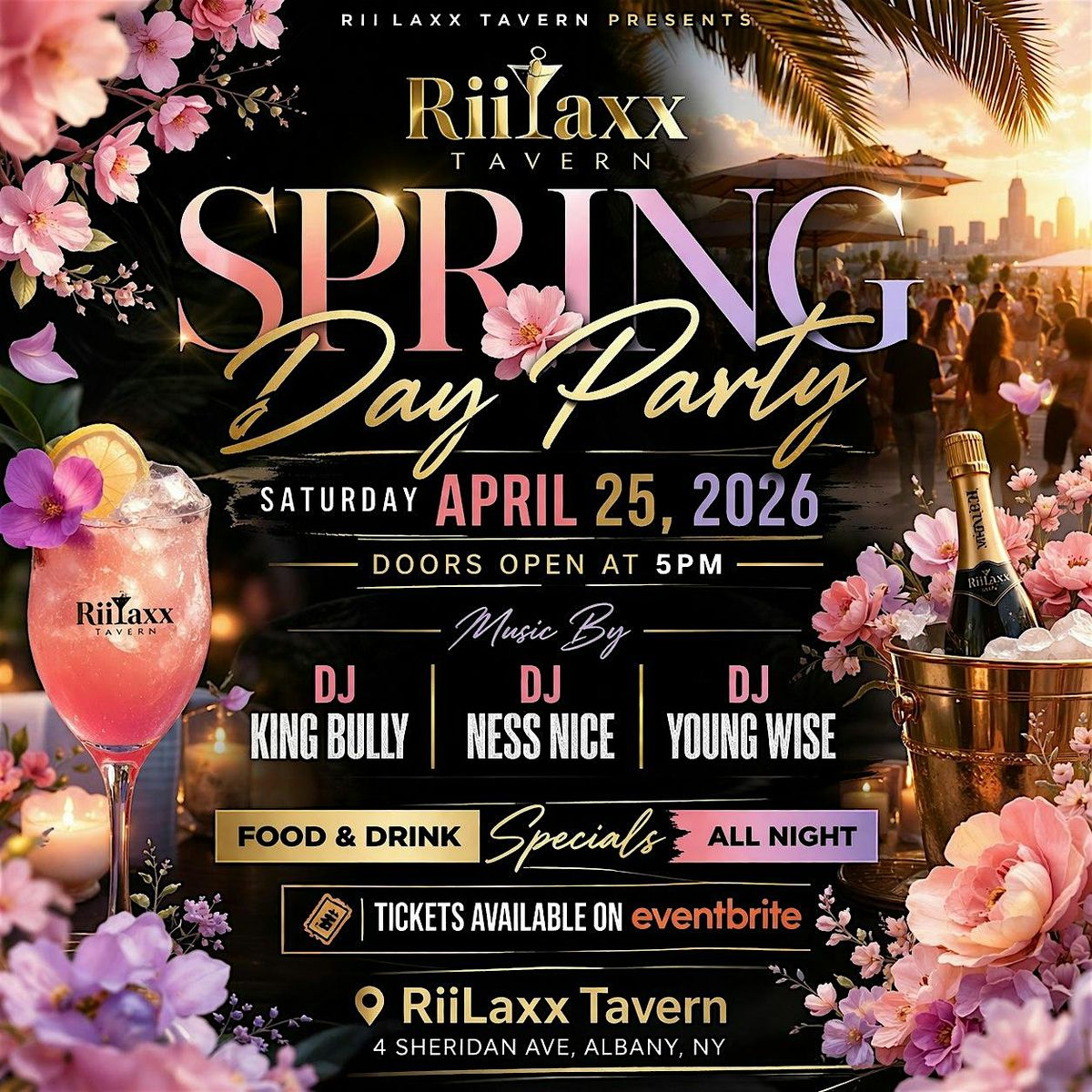 Get ready for a Spring Day Party at the cozy RiiLaxx Tavern! Join us on April 25, 2026 at 5:00 PM (Eastern Daylight Time) for great food, great vibes, tasty drinks, and awesome company. 518's very own Dj King Bully, Dj Ness Nice, and Dj Young Wise will be on the 1s & 2's!!