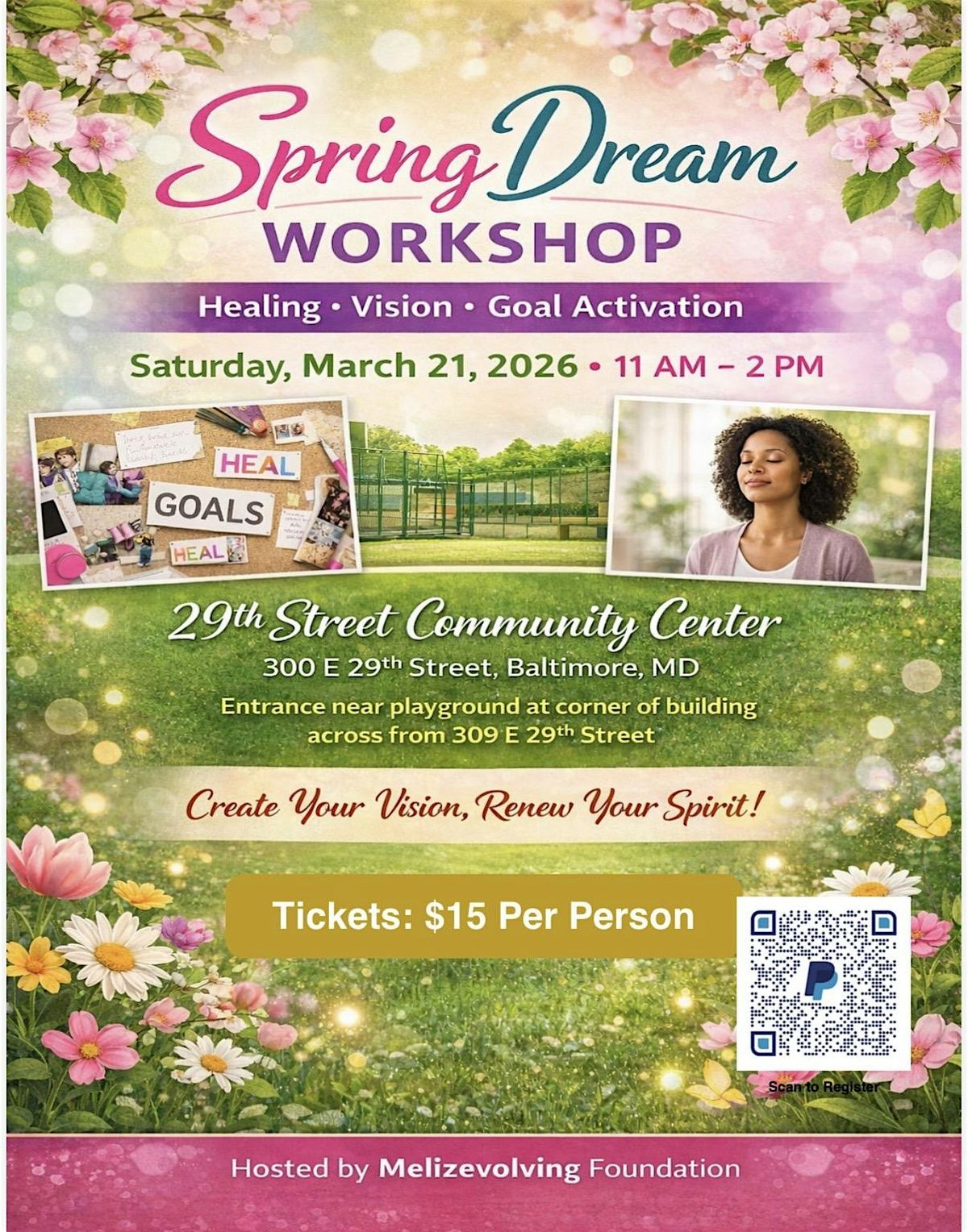 The Spring Dream Workshop, hosted by the Melizevolving Foundation, is a trauma-informed healing and vision board experience designed to help participants reflect, reconnect with themselves, and create a clear vision for their future. Attendees will engage in guided reflection, supportive conversations, and a hands-on vision board activity in a welcoming community environment. Each participant will receive a gift bag and their own vision board to take home. 🌸