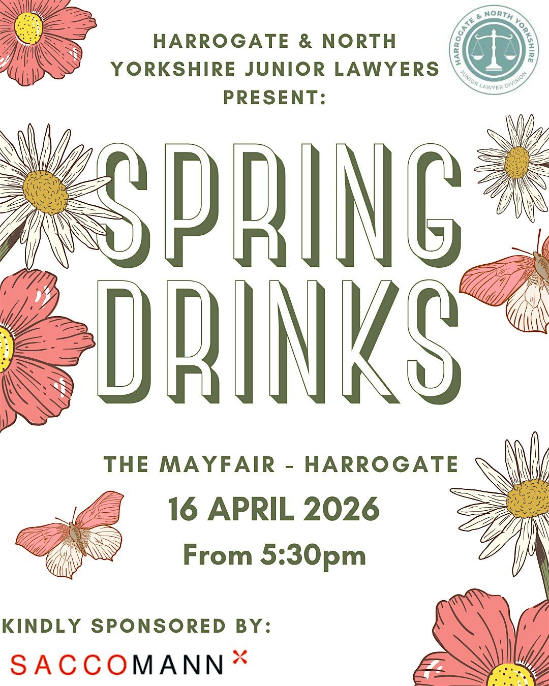 - Join us for a fun and relaxed in-person gathering to welcome spring! It's the perfect chance to catch up, network, and unwind with fellow junior lawyers from Harrogate and North Yorkshire. Whether you're new to the area or a familiar face, come along for good vibes, great drinks, and even better company. Don’t miss out on this laid-back evening. Drinks and nibbles included in your ticket - thanks to the kind sponsorship from SaccoMann