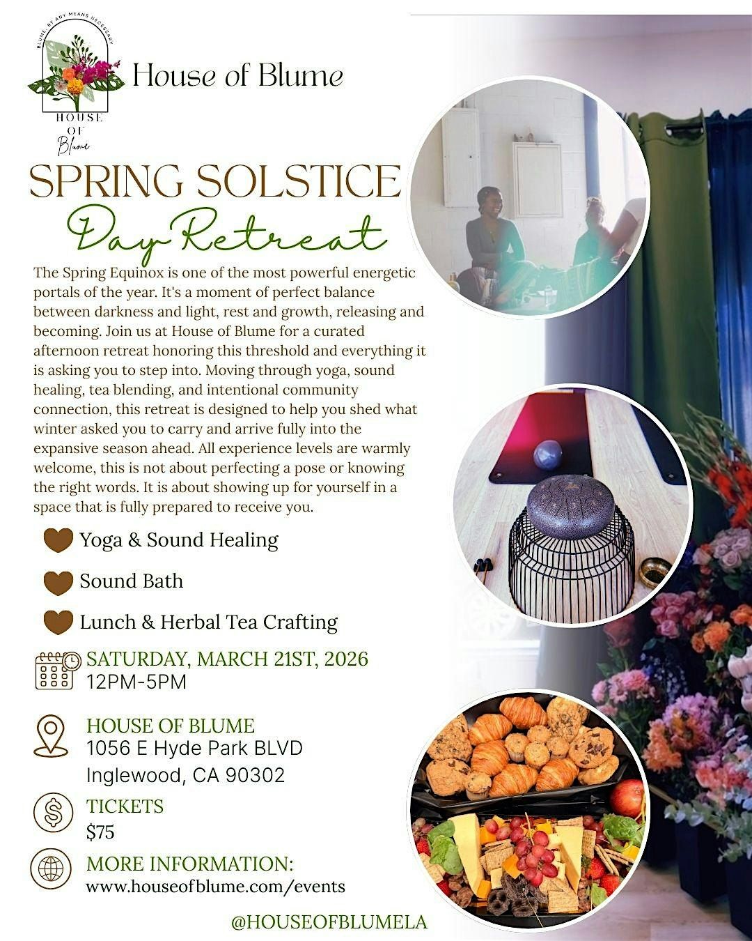 The Spring Equinox is one of the most powerful energetic portals of the year. It's a moment of perfect balance between darkness and light, rest and growth, releasing and becoming. Join us at House of Blume for a curated afternoon retreat honoring this threshold and everything it is asking you to step into. Moving through yoga, sound healing, tea blending, and intentional community connection, this retreat is designed to help you shed what winter asked you to carry and arrive fully into the expansive season ahead. All experience levels are warmly welcome, this is not about perfecting a pose or knowing the right words. It is about showing up for yourself in a space that is fully prepared to receive you.