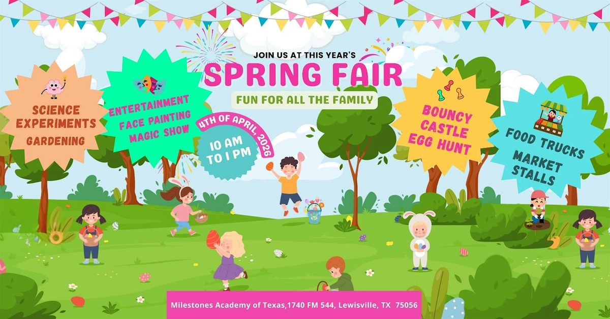 Get ready for spring at the Milestones Academy of Texas Spring Fair! Mark your calendars for a fun-filled community day on Saturday, April 4th, 2026, from 10:00 AM to 1:00 PM at our campus (1740 FM 544, Lewisville).