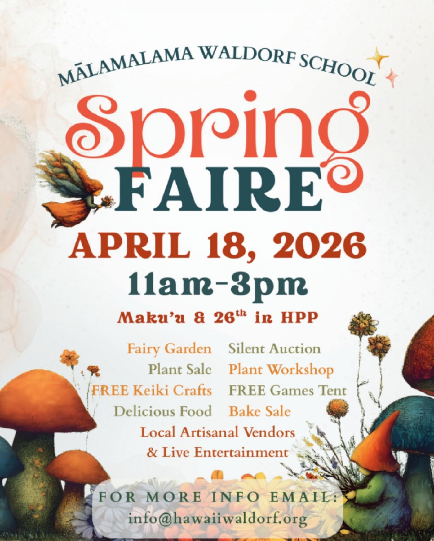 Join us for Mālamalama Waldorf School’s Spring Faire on Saturday, April 18, 2026 from 11:00 a.m. to 3:00 p.m. at Makuʻu & 26th in Hawaiian Paradise Park.