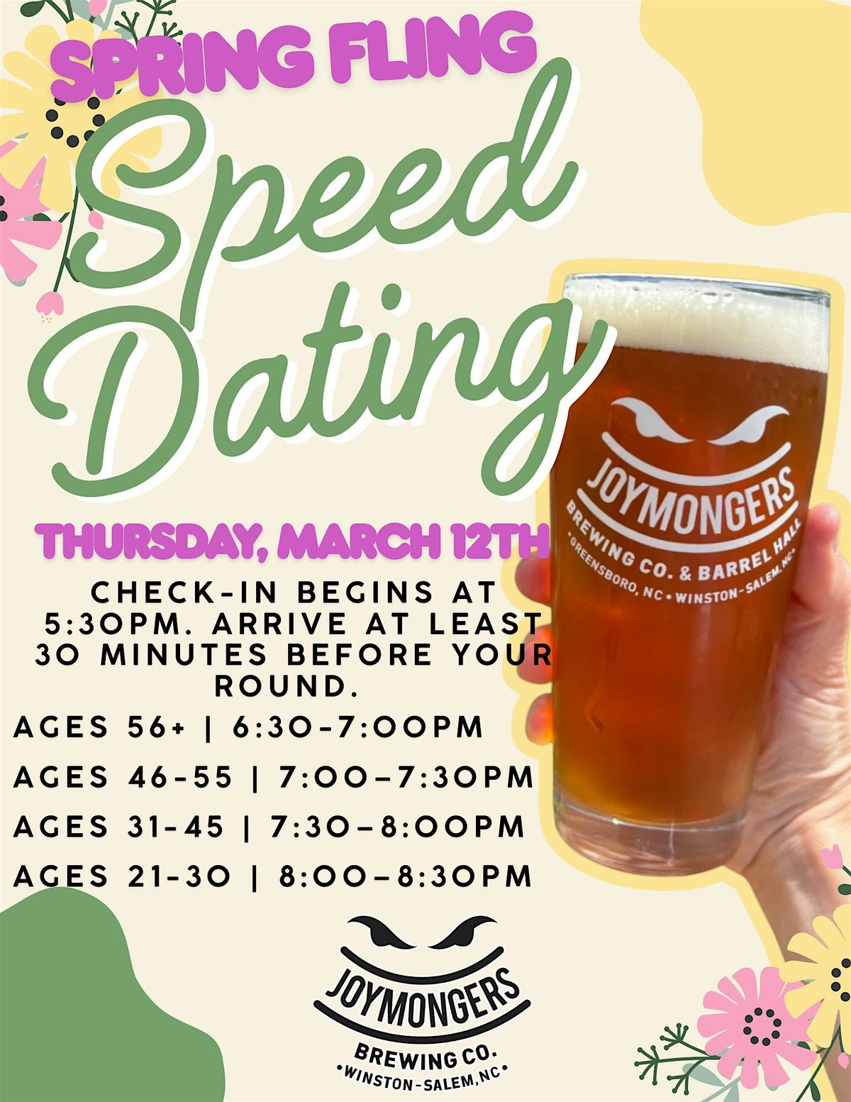 🌸❤️Ready to meet someone new this spring? Join us for Spring Fling Speed Dating at Joymongers-Winston, a fun, structured, and low-pressure way to connect with local singles — no apps, no swiping, just real conversations over great drinks.