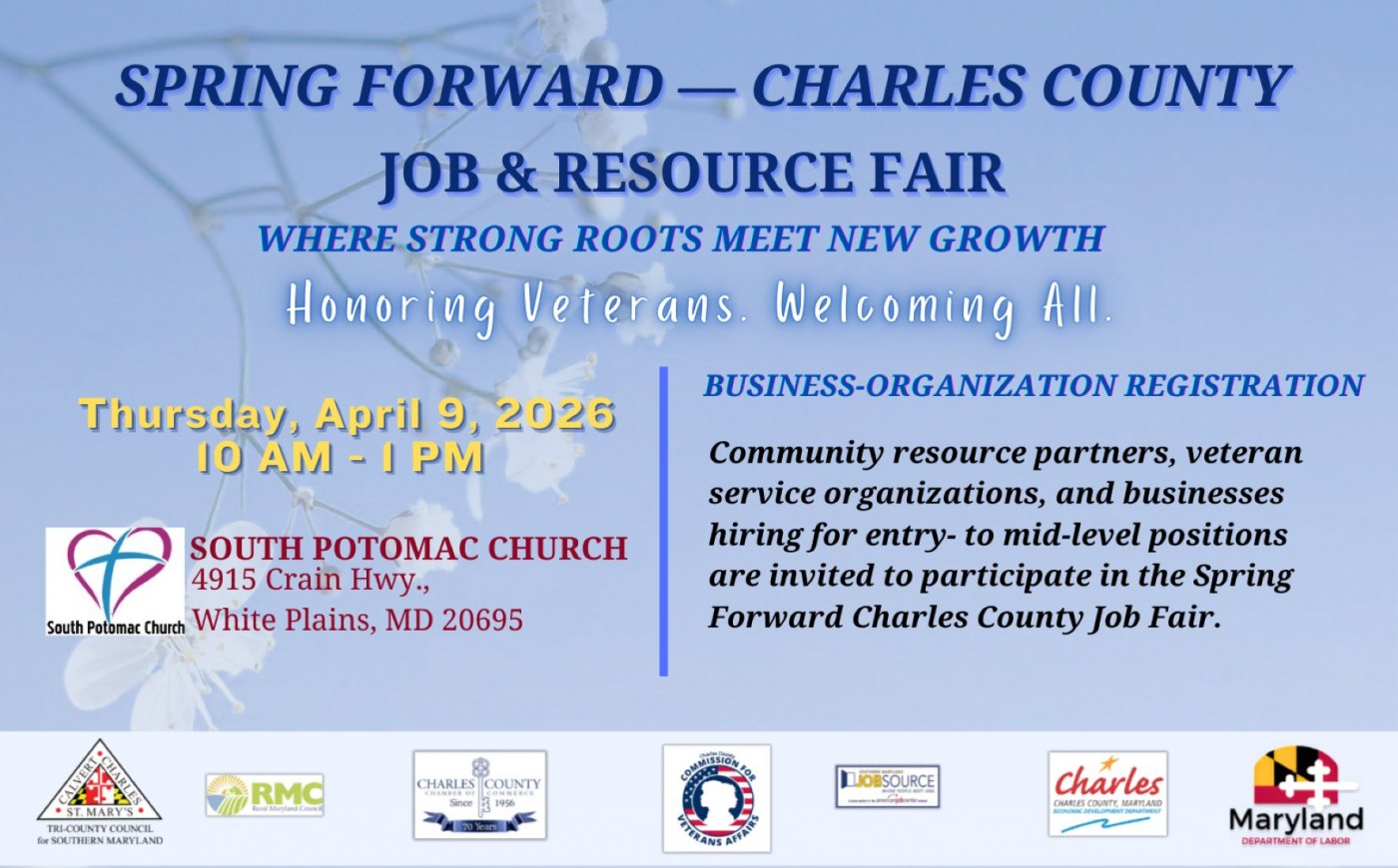 We are looking for community resource partners, veteran service organizations, and businesses hiring for entry- to mid-level positions to participate in the Spring Forward Charles County Job Fair.