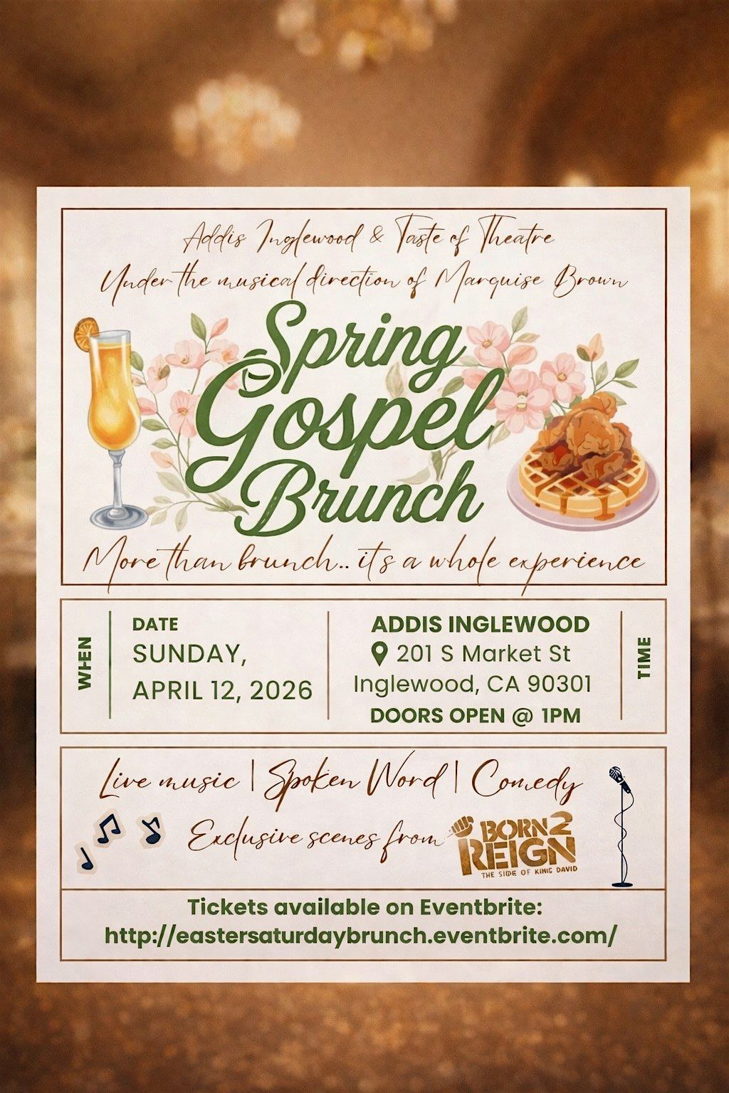 Taste of Theatre: Spring Gospel Brunch Experience is a premium afternoon of live music, spoken word, comedy, and theatrical moments: including exclusive scenes from the upcoming production “Born 2 Reign.”