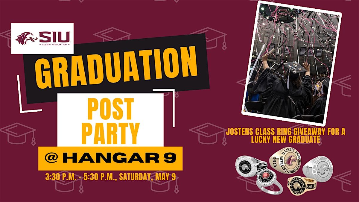 The SIU Alumni Association and friends are celebrating the newest Salukis for Life at Hangar 9 on Saturday, May 9, immediately following Southern Illinois University's commencement ceremonies, from 3:30 p.m. to 5:30 p.m.