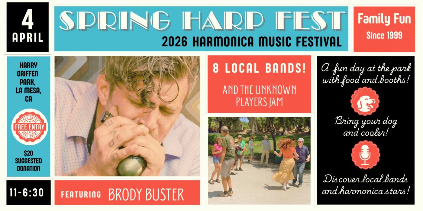 Since 1999, Spring Harp Fest has offered an all-volunteer, free, outdoor harmonica music festival with stellar soloists. This year, Brody Buster, past winner of the International Blues Challenge, headlines the event, backed by the Blue Healers. Other performers include SoCal artists Billy Watson and the International Silver String Submarine Band, Troy Sandow, Gonzalo and Friends, the Harmonica John Frazer Band, Jump Start with Mike Maldanado, and Dan McDowell with The Tradition.