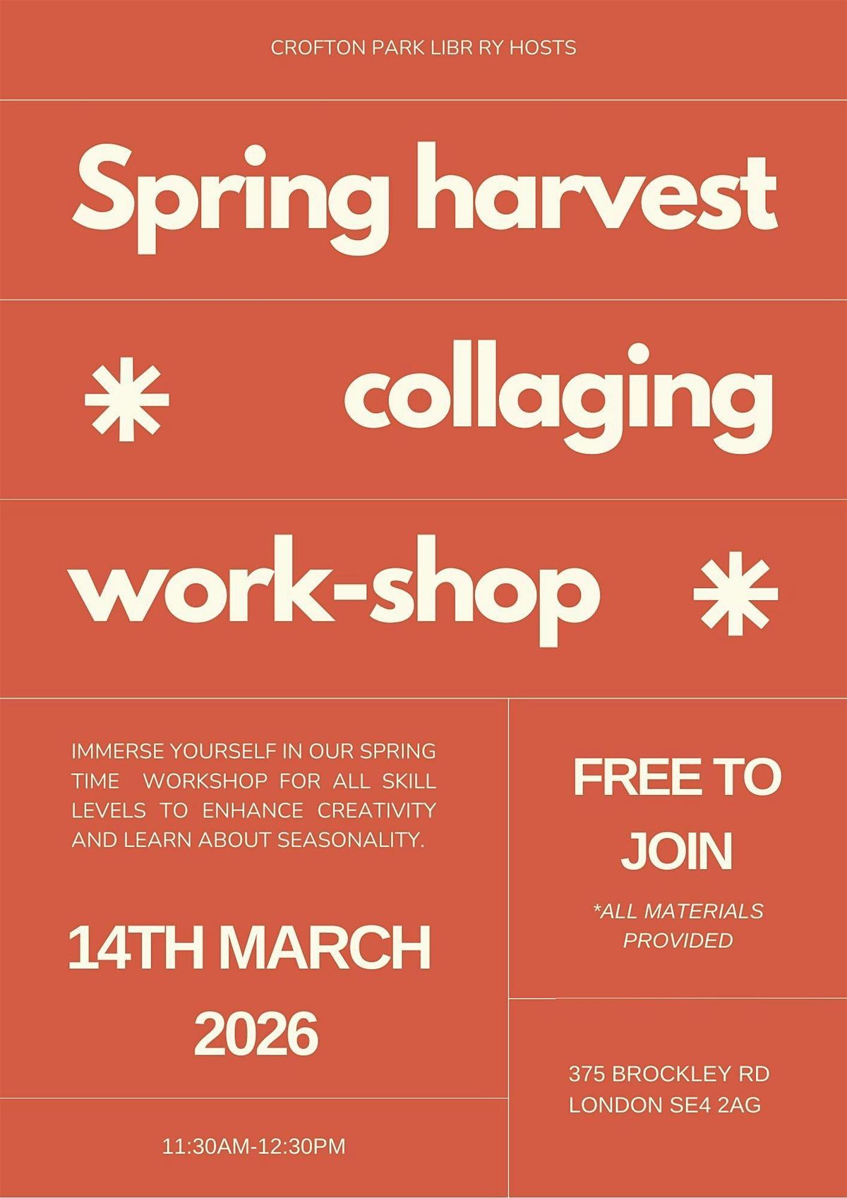 Join us at Crofton Park Library on March 14, 2026 at 11:30 AM (GMT) for a fun and creative collaging workshop. Whether you’re a beginner or a pro, come along to make some cool spring-themed collages, share ideas, and enjoy a relaxed, friendly vibe. All materials will be provided, so just bring your creativity and good mood!